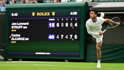 El martilleo permanente de la rodilla de Juan Carlos Ferrero no es un buen indicativo. El técnico sufre en el banquillo y sobre el verde lo hace su jugador, Carlos Alcaraz, que busca soluciones por todos lados y no encuentra la forma de bloquear la bola meteórica de Jan-Lennard Struff. El alemán, un bombardero de 1,93 que despide pólvora en todos y cada uno de sus servicios, percute una y otra vez, y sitúa al murciano al borde del abismo. Ocurre que en ese territorio terminal, el español acostumbra a descorchar sus mejores golpes y cuando más aprieta la soga, mejor replica. ¡Pim-pam-pum! Así responde, así se levanta y así invierte el enrevesado cruce de la jornada inaugural de Wimbledon: 4-6, 7-5, 4-6, 7-6(3) y 6-4, tras 4h 11m.