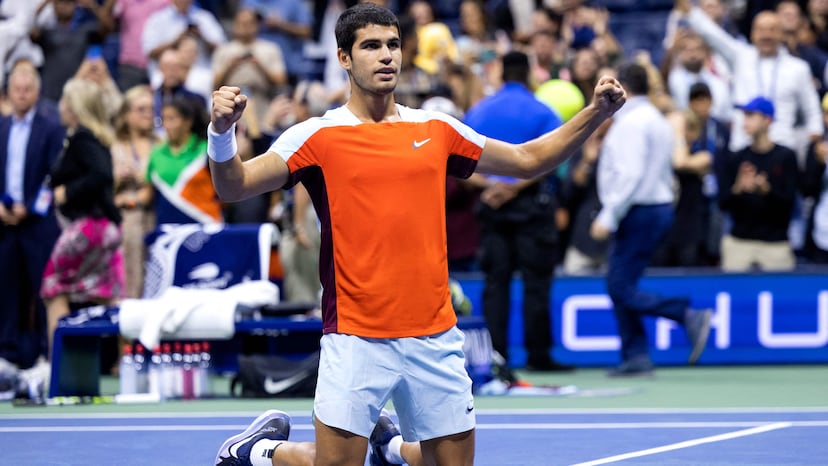 De madrugada, 2.50 en Nueva York para ser exactos, finaliza una acción-reacción completamente salvaje. Carlos Alcaraz clava las rodillas en la central y boquea exhausto después de un tira y afloja histórico con Jannik Sinner, al que finalmente ha rendido cuando el italiano ha tenido antes el pase a las semifinales a falta de un empujón, del tiro de gracia. Se dice que el español, 19 años, está hecho de otra pasta y lo demuestra: sortea una bola de partido en contra, se levanta y engarza una victoria estratosférica: 6-3, 6-7(7), 6-7(0), 7-5 y 6-3. Se resuelve el thriller nocturno en 5h 1...