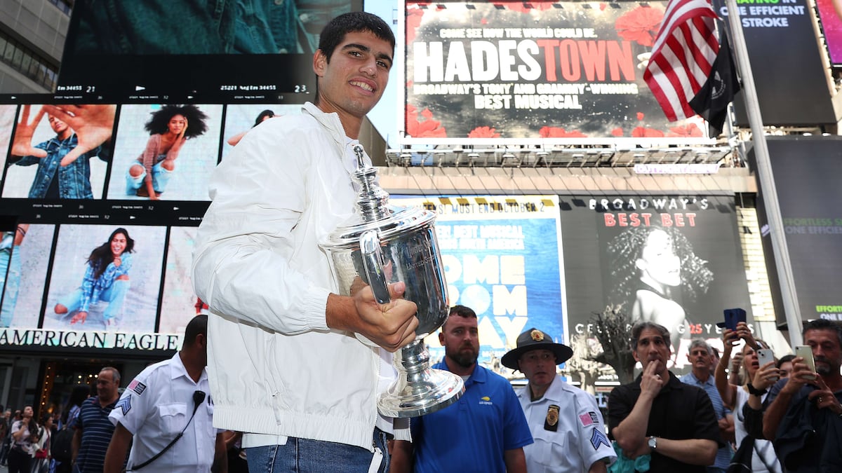 Es la una de la tarde en Nueva York y Carlos Alcaraz (El Palmar, Murcia; 19 años), el número uno más joven de la historia del tenis y reciente campeón del US Open, recibe a un reducido grupo de periodistas. La charla con los tres corresponsales y dos enviados especiales —entre ellos EL PAÍS— se extiende durante 15 minutos y transcurre en la planta 37 de un rascacielos de cristal localizado en la intersección entre la Octava Avenida y la Calle 44. El murciano departe tranquilo y, tanto en sus andares como en su expresión, se percibe que la noche ha sido larga y que el esfuerzo físico efectuado para conquistar su primer Grand Slam —con un registro de 23h 39m en siete partidos, récord— le ha pasado factura. “Sí, ya se nota un poco el cansancio…”, corrobora con un apretón de manos. Con unos tejanos y una chaqueta blanca, juguetea con una botella de agua mientras conversa.