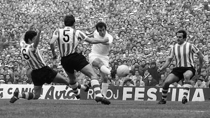 Su magnética habilidad para hacer moñas con los pies le provocaron muchos disgustos. No solo porque un sector le veía como un chupón. Eso no era lo peor. Lo grave eran los matarifes que le segaban las piernas sin contemplaciones, lo que llevaba a Amancio no solo a la enfermería, sino al fútbol protesta por el poco blindaje arbitral. El 8 de junio de 1974, en un partido de cuartos de Copa disputado en Los Cármenes, el paraguayo Pedro Fernández le rajó el muslo derecho con una escalofriante clavada de tacos. El zaguero no vio ni tarjeta, pero ante el clamor popular fue sancionado con 15 partidos. “Amancio nunca me perdonó”, diría el paraguayo en EL PAÍS en octubre de 2019. El madridista, ya con 34 años, nunca volvió a ser el Brujo que era. Jugador de una valentía temeraria, contaba que le pegaban hasta por encima de las piernas para que no cojeara.