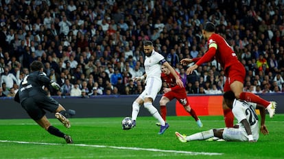 Alisson ya no tuvo remedio en el tanto de Benzema. Van Dijk rebañó un geométrico pase interior de Camavinga, jabato toda la jornada, a Benzema. La pelota llegó a Vinicius, que dio un patadón al aire antes de asistir al capitán, que sopló la pelota a la red con la puerta abierta de par en par. Ancelotti intervino para retirar al dolorido Benzema, al incombustible Modric, al eterno Kroos —jugador de la noche— y al punzante Vinicius. El Barça a la vista.