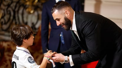 Al final, fue una niña de unos 6 años la que se plantó con un micrófono ante Karim Benzema y le preguntó: “¿Te vas a quedar?”. El capitán del Real Madrid, que no comparecía de manera formal en público desde la víspera de la final de la Supercopa de España, en enero en Riad, había acudido este jueves a un salón del Casino de Madrid, a unos pasos de la Puerta del Sol, para recoger el premio que le había concedido un periódico, el Marca leyenda. La pregunta la hizo la niña, y el pequeño auditorio se sacudió la tensión acumulada con un aplauso. Benzema escogió alimentar una intriga que ha cambiado estos días el paso de la planificación deportiva del club para este verano: “Por el momento estoy aquí. Disfruto cada día, entrenando bien, y hay un partido este sábado”.
