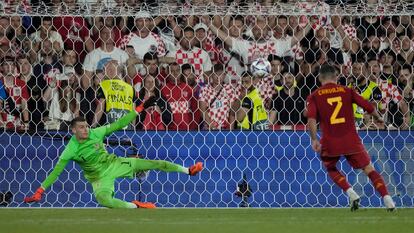 “Unai la ha liado en los penaltis”, dijo Joselu. “Ha salido redondo”. Cerca de él, Dani Olmo consolaba a los rivales. Pasó cinco años en Croacia, un lustro decisivo para su formación en el Dinamo de Zagreb, club al que llegó con 16 años tras dejar La Masia en una pirueta futbolística nada habitual. En el país balcánico sigue su hermano Carlos, que este sábado se llevó un varapalo al bajar a Tercera División con el NK Kustosija, un modesto club de la capital croata. “La Santísima Trinidad para mí es el Dinamo, Zagreb y Croacia”, explicó en su día en una sentencia que despertó todo tipo de expectativas. En la primavera de 2019, el seleccionador Zlatko Dalic pidió al gobierno de su país que agilizase los trámites para una nacionalización. “Espero que no suceda como lo que ocurrió con Ibrahimovic”, dijo. Poco después, aquel verano, Olmo fue pieza esencial para Luis de la Fuente para ganar el Europeo sub-21. En noviembre del mismo año debutó a las órdenes de Luis Enrique. Y cuatro años después ganó su primer título con España... ante Croacia.