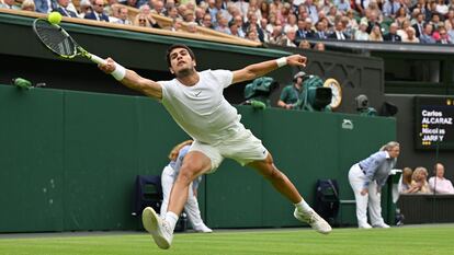 La atmósfera en la central es pesada. Día de bochorno en Londres, el techo está cerrado por el aguacero que persiste hasta el inicio de la tarde y en el palco real, Billie Jean King comenta, Gary Lineker dispara fotos con el móvil y Stefan Edberg, el nórdico elegante en el que se inspiró Roger Federer, viaja mentalmente hacia aquellos maravillosos años (el 88 y el 90) en los que triunfó en la Catedral. El sueco, o el arte de danzar en la red. Cuando debe hacerlo, Alcaraz también luce maneras privilegiadas. Responde al arrebato final del adversario con jerarquía, recuperando una rotura en contra en la cuarta manga y soltando el latigazo definitivo que evita una dilatación comprometedora. Ante el primer escenario delicado que le plantea el torneo, el murciano (20 años) reacciona de la mejor manera posible: aquí mando yo. El tenis rara vez ofrece caminos en línea recta sino muchas curvas, y la vía del sufrimiento conduce esta vez a Alcaraz a buen puerto. A otra de esas victorias de valor doble.