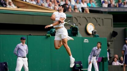 Preguntado hace unos días sobre cuáles de sus condiciones destacaría, Alcaraz mencionaba la elasticidad y la explosividad, atributos de los que hace gala estos días en Wimbledon. Nadie maniobra con tanta cilindrada como él y solo Novak Djokovic, el hombre de goma, es capaz de dilatar tanto su musculatura en la estirada. Le obliga a la extensión Berrettini una y otra vez, pero el italiano se encuentra con un cazador de moscas que todo lo alcanza y casi todo lo devuelve. Ahí hay un gato. Al resto, el murciano luce palmito y somete al rival a un maquiavélico juego de precisión: por mucho que afines, ahí voy a estar yo. El tallo romano (27 años y 1,96) busca las líneas en el servicio, angula, rectifica para engañar o bien tira al cuerpo. Todo lo prueba. Los porcentajes son notables, pero a cada pelotazo llega la herramienta; progresivamente decrecen, al compás de la desconfianza del bombardero.