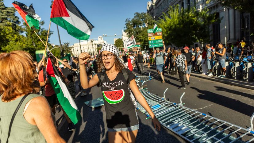 Ni tanquetas, ni decenas de furgones cruzando con las sirenas encendidas las calles más transitadas de Madrid, ni policía montada, ni antidisturbios: cuando es una mayoría la que desborda, no la para ni la violencia, que la hubo. En cuestión de pocos minutos la Vuelta quedaba sentenciada por la ocupación del circuito con el que se clausuraba la carrera entre cánticos (“No es una guerra, es un genocidio”, “Israel asesina, la Vuelta patrocina”). A la altura de Gran Vía con Valverde, dos hombres mayores se enzarzan en una discusión. Uno la zanja violentamente dándose la vuelta y siguiendo su camino, calle arriba: “¡Es un gobierno de asquerosos!”. Llegando a Alcalá, un padre con su hijo, que va con un maillot de ciclista, se encara con unos manifestantes: “Iros a vivir a Palestina, donde machacan a las mujeres y a los homosexuales”. Uno de esos manifestantes, Javier, un madrileño de 30 años que lleva en Gran Vía desde las tres de la tarde, dice a este periódico después de ver marcharse al niño del maillot: “Es injusto para los ciclistas y para los aficionados, claro, pero nada comparado con lo que está pasando en Gaza, y de alguna manera hay que visibilizarlo. Ya está bien. Es una masacre, es un genocidio. Que ese padre le explique a su hijo al llegar a casa lo que pasa con los niños en Palestina, por qué están tristes ellos”.