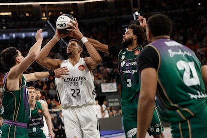 El Real Madrid tumbó al campeón de la Copa para citarse en semifinales con el anfitrión. El conjunto blanco despachó en cuartos al Unicaja Málaga con una solvencia inesperada en cualquier pronóstico y se ha citado este sábado con el Valencia en su caldera del Roig Arena para discutir un puesto en la final. No hubo partido en la reedición del encuentro decisivo del año pasado porque los blancos mandaron de principio a fin y los malagueños apenas dijeron ni mu, muy rebajados por las bajas (Tyson Pérez, Tillie, Kravish) e incapaces de mirar a la cara a un rival muy serio. Ese Madrid-Valencia promete emociones más fuertes en un escenario a la altura.