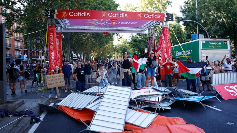 La Vuelta a España acabó antes de tiempo, sin podio y sin celebración. Un grito en defensa del pueblo palestino y puntuales brotes de violencia se impusieron sobre la carrera y la meta, el punto final, y previsible, después de tres semanas que han girado más alrededor de la política que del discurrir del evento deportivo. Todo comenzó con el rechazo a la participación en la prueba del equipo Israel-Premier Tech, que hasta el último día se ha mantenido en la carrera a pesar de las presiones a la organización, y al propio equipo, para que se retirara. Nunca ocurrió, y el remate fue esta caótica etapa en y por Madrid que finalizó con violencia, cargas policiales y sin ceremonia. Y que ha provocado una nueva tormenta política en el ya agitado ambiente nacional.