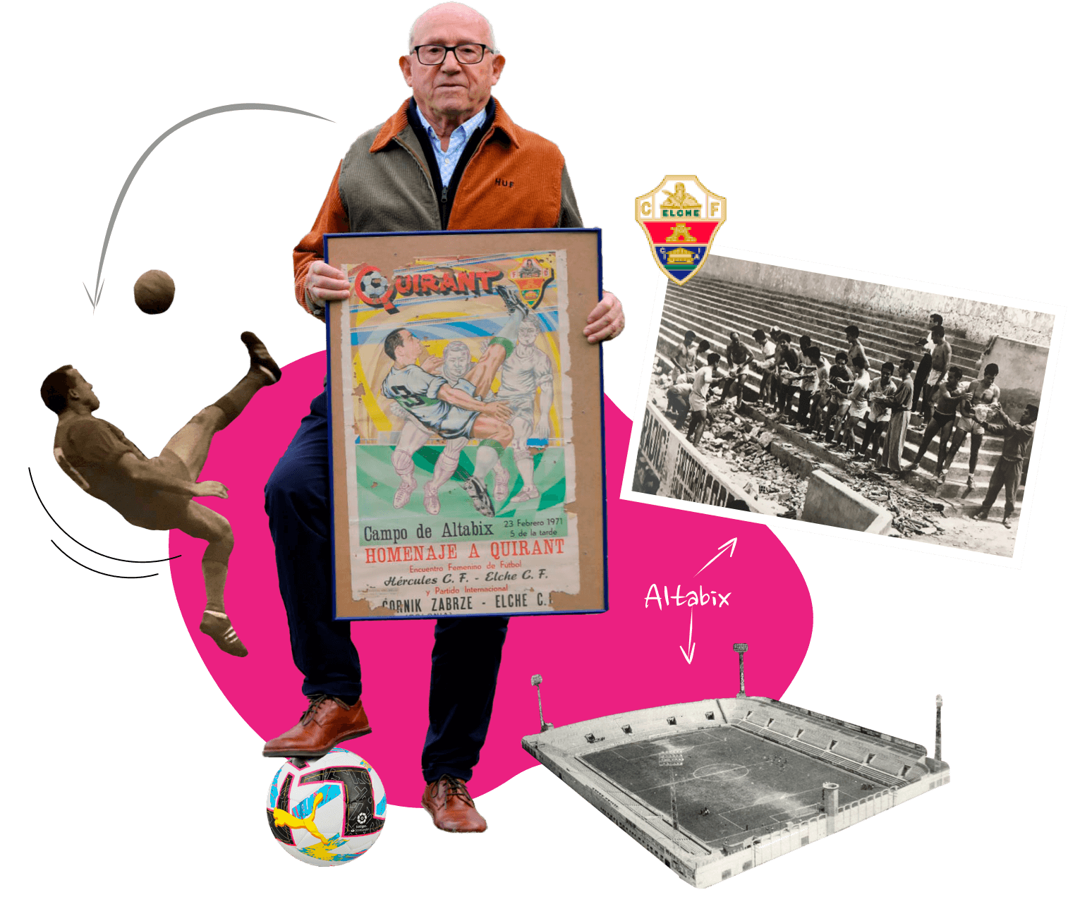 Quirant pasó de jugar en campos de tierra “donde muchas veces había desniveles” a hacerlo en el césped del Santiago Bernabéu o del Camp Nou. Eso le permitió dejar la fábrica y centrarse en el fútbol, donde hizo historia al convertirse en el jugador del Elche con más partidos (361) hasta que el delantero Nino le arrebató el récord en 2020.