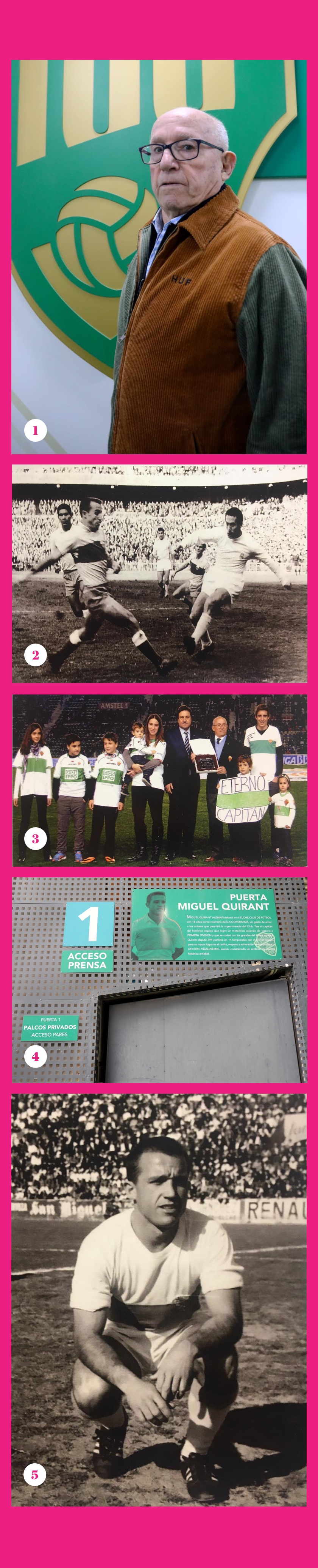 1. Miguel Quirant posa frente al escudo del club ilicitano. 2. El exfutbolista en una acción durante un partido en el Santiago Bernabéu frente al madridista Gento en la temporada 1959/60. 3. Quirant, junto a sus nietos y el expresidente del Elche CF, José Sepulcre, en un homenaje al exjugador en 2009. 4. Puerta de acceso al estadio Martínez Valero con el nombre del exfutbolista. 5. Quirant en su etapa como futbolista del Elche CF. FOTOS CEDIDAS / JOAQUÍN DE HARO