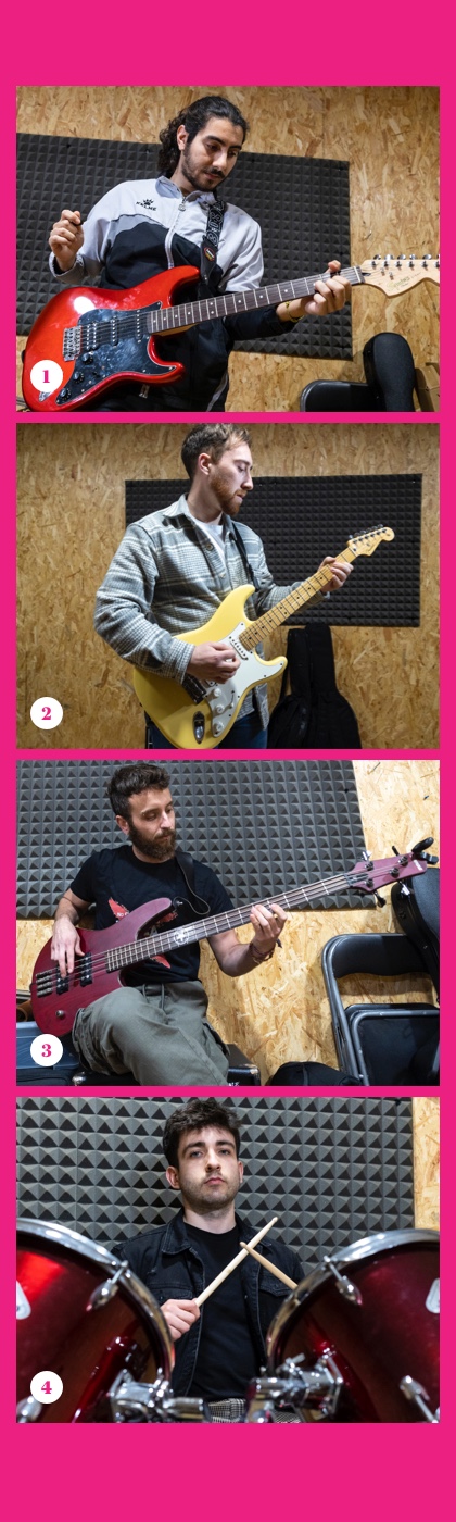 1. Iván Santos, de 26 años, voz y guitarra de La Aldea. 2. Adrián García, de 24 años, toca la guitarra durante un ensayo del grupo. 3. Gabriel Camarelles, de 28 años, posa con su bajo. 4. Álvaro Jiménez, baterista de 26 años, en el local Tras la puerta de Vila-real (Castellón).