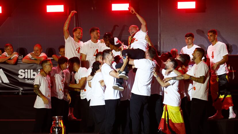 Por el escenario apareció Ibai Llanos, pero el jefe del micrófono fue Álvaro Morata, que tras recordar a los pioneros (Casillas, Xavi, Pujol...) presentó uno a uno a sus compañeros: “Carvajal, el jabalí de España, ¿dónde está Musiala?”; “Fabián es una farola entrenando, no se mueve”; “Mikel Merino, el espíritu de Puyol”; “Rodrigo, nos hemos picado un par de veces, pero es un Balón de Oro” (mientras Joselu señalaba a su cuñado Carvajal); “Nico, en Bilbao le han echado una gasolina que no existe”; “Lamine ha pasado de liarla en clase a liarla en la Eurocopa”; “Oyarzabal, ¿qué te dije el día de la final? Que te olía el pie a gol”; “Navas es una leyenda, habría que meterlo en la Federación o en el Gobierno”... Y así uno a uno. Luis de la Fuente fue manteado antes de dejar un mensaje de fondo (“este equipo es un ejemplo, unidos somos más fuertes”) y arrancarse sin chuleta con un Julio Iglesias en compañía de su amigo Patxi Salinas. Mientras, Rodri no paraba de gritar “Gibraltar es español”. Morata le tuvo que recordar que jugaba en Inglaterra.