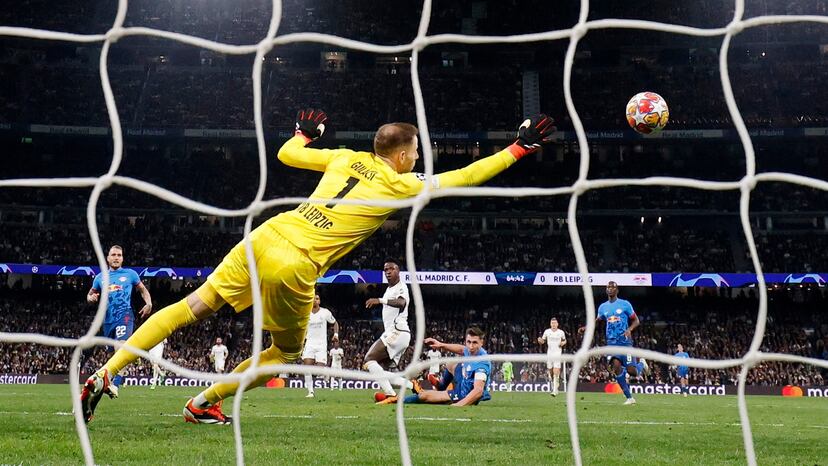 El RB Leipzig presiona con todo. Olmo, solo en el área, le tira una vaselina a Lunin, pero el balón golpea en la parte superior del larguero.