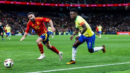 Brasil apenas asomaba en alguna conducción de Rodrygo, sin apenas señales de Paquetá por el centro, mientras Yamal y Nico regalaban un recital. En una de las fugas del extremo del Athletic, el árbitro creyó ver penalti, aunque luego colocó la pelota para la falta fuera del área. Él y Yamal eran un tormento indescifrable. El azulgrana filtró un pase a Olmo, que se sumó a la fiesta con un caño a Beraldo, un regate hacia fuera y el 2-0. España fluía en todos sus registros y en Brasil no aparecía ni Vinicius, el centro del partido contra el racismo, un amistoso que dejó de serlo muy pronto. Pese a la cartelería de buen espíritu, se cruzaban dos selecciones de fuste, que no estaban dispuestas a ceder un centímetro ni en un córner: empujones, choques, reclamaciones al árbitro y una breve sucesión de amarillas subrayaron los picos de voltaje.