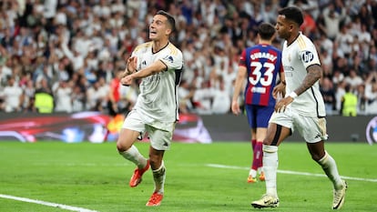 En un Madrid con resaca emocional y física tras el extenuante paso por la trituradora del Etihad, nada le resultó más reconstituyente durante muchos momentos que el entusiasmo de Lucas Vázquez. Los blancos se presentaron en el clásico a verlas venir, desprendiendo una sensación de dominio de la escena, pese a que solo controlaron el marcador los tres minutos finales. El gallego, en cambio, no dejó de picar de principio a fin. Forzó el penalti del empate a uno después de ventilarse a Cancelo y encarar a Cubarsí, remachó la igualada a dos en una asistencia de orilla a orilla de Vinicius y, cuando la grada ya daba por buenas las tablas, otra estirada suya por la derecha y pase terminal a Bellingham, que no anotaba desde hacía dos meses y medio.
