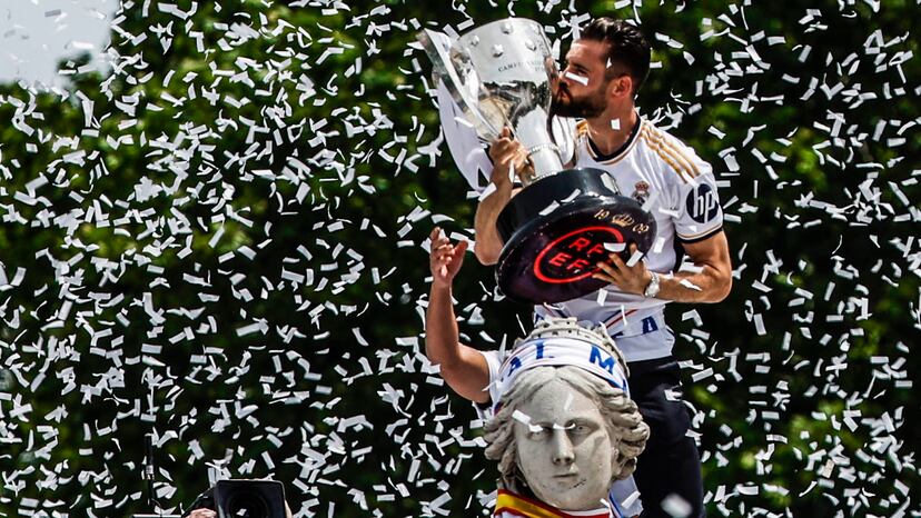 Resultaba imposible dejar de mirar a Londres, pero Nacho insistió varias veces en “disfrutar el momento”. Para él, que entró al club con 11 años y cumple su primera temporada como capitán, el día contenía ingredientes aún más especiales: “Se me ponen los pelos de punta”, decía al principio de la jornada, aún en Valdebebas, después de que el presidente de la Real Federación Española de Fútbol, Pedro Rocha, les entregara el trofeo en circunstancias bastante inusuales. Lo hizo a puerta cerrada, sobre la hierba de un campo de entrenamiento, después del desajuste del calendario que impidió que el Madrid recibiera la copa en un estadio. Rocha saludó al cuerpo técnico y a los futbolistas, se fotografió con ellos y desapareció, mientras la expedición comandada por Nacho emprendía su trayecto hacia el centro de Madrid. “He ido muchas veces a La Cibeles, por suerte. Pero hoy me toca como primer capitán ponerle la bufanda... Llevo todo el año soñando con que llegara este momento”, explicaba el capitán antes de salir de Valdebebas.