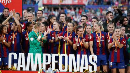 Tras ganar la Copa de la Reina, las futbolistas del Barça recibieron este sábado sobre el césped de La Romareda (Zaragoza) las medallas de campeonas de manos de su propio cuerpo técnico. “¿Es broma? ¿Es broma?”, le preguntó riendo Salma Paralluelo a uno de los delegados mientras este le entregaba la condecoración. La delantera azulgrana ya había vivido un episodio desagradable en enero del año pasado en Mérida en la final de la Supercopa de España, cuando nadie les dio las medallas. Las futbolistas azulgrana se tuvieron que acercar entonces a una mesa para recogerlas en una imagen con una carga simbólica enorme por la comparación con lo que había pasado en la final masculina, en la que el entonces máximo mandatario de la Real Federación Española de Fútbol, Luis Rubiales, se las colgó a los futbolistas en el cuello.