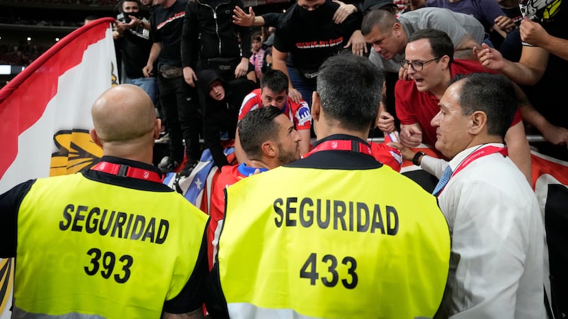 El bochorno del derbi de los mecheros terminó de una manera extraña a la altura del desenlace en el segundo tiempo. Con Le Normand en la hierba después de recibir un golpe en la cabeza cuando Tchouameni intentaba rematar un centro. Sin que se agotara el tiempo. Con el árbitro harto de un partido que había tenido que detener durante más de veinte minutos por el lanzamiento de objetos del fondo sur del Metropolitano al área de Thibaut Courtois. De nada sirvieron los avisos de la megafonía ni las peticiones de varios jugadores y de Simeone. El fondo siguió lanzando mecheros, y al acabar el encuentro los futbolistas del Atlético se fueron a celebrar con ellos mismos el empate in extremis de Correa que los deja a ellos y al Madrid un punto más cerca del Barça, que tropezó en Pamplona.