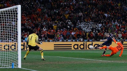 Iniesta es el autor del gol que dio la Copa del Mundo a España en Sudáfrica el 11 de julio de 2010. El centrocampista nacido en Fuentealbilla (Albacete) culminó una excelente fase final, después de superar un momento anímicamente muy delicado por una grave lesión a la que no encontraba remedio, con un disparo cruzado en el minuto 116 de la final que superó a Stekelenburg, el portero de Países Bajos. Aquel tanto alcanzado en la prórroga desató la euforia de aficionados y comentaristas mientras Iniesta celebraba el éxito con una jubilosa carrera que se convirtió también en un recuerdo para su amigo Jarque, fallecido en 2009.