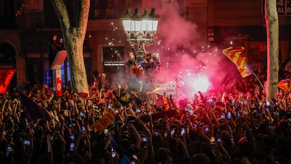 A cerca de 10 kilómetros de distancia del RCDE Stadium, la fuente de Canaletas en Las Ramblas del centro de Barcelona era una fiesta. Bengalas rojas y azules, petardos y fuegos artificiales, banderas de todo tipo, los habituales cánticos inundando el silencio de la calle. Algunos aficionados ya se agolparon el miércoles cuando el Real Madrid rozó el empate. En su móvil, sentados en los bancos, miraban el partido contra el Mallorca. “Mañana volvemos”, gritaron al sonar el pitido final. Y cumplieron. Los seguidores azulgranas, tanto los veteranos que sufrieron no conocer títulos, como los que gozaron los éxitos de Guardiola y Messi acudieron a la cita con camisetas llenas de nostalgia. Pero sobre todo estaban presentes y hacían ruido los más jóvenes, los que vivieron las crisis, las salidas de las estrellas y las derrotas en Europa. Son ellos los que se ven reflejados con quienes comparten generación: Lamine Yamal, Pedri, Cubarsí, Gavi, Fermín. En sus espaldas, principalmente, el ‘19’ y los dorsales de los más jóvenes. Pero en Canaletas, epicentro histórico culé, todas las generaciones se unieron al ritual de las victorias, cantando al presente, y también al futuro de un equipo que siente recuperado su orgullo.