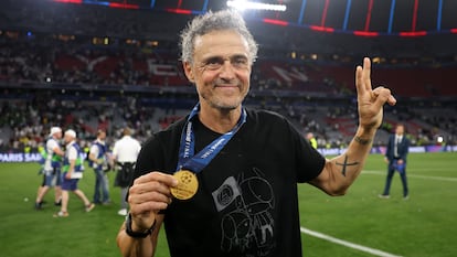 En la fiesta del Paris Saint-Germain, Xana, la hija de Luis Enrique que falleció en 2019 por un osteosarcoma (un cáncer que afecta a las células que forman los huesos), estuvo presente con su padre. Ya lo avisó Luis Enrique en la rueda de prensa previa a la final de la Champions ante el Inter. “Recuerdo una foto que tengo increíble con ella en la final de Berlín, después de ganar la Champions, clavando una bandera del Fútbol Club Barcelona en el campo. Tengo el deseo de poder hacer lo mismo con el PSG. No estará mi hija físicamente, pero estará espiritualmente y eso para mí es muy importante”, concedió el técnico asturiano el viernes. Y así sucedió. Este sábado, lo primero que hizo Luis Enrique tras realizar una gran carrera por el césped del Allianz Arena de Múnich tras el pitido final, fue recoger una camiseta negra que le entregaron envuelta en una bolsa de plástico. Una camiseta que emulaba aquel momento que el entrenador del PSG recordó en rueda de prensa con un boceto del logo de la Fundación de la pequeña Xana.