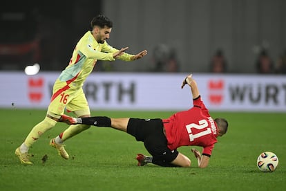 Iuri Tabatadze carga con el cuerpo a Marc Cucurella para que no pueda poner el centro. El jugador del Cádiz debuta como internacional absoluto en el día de hoy.
