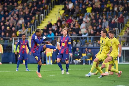 El invierno empezó con una victoria del campeón y también líder Barça. La mejor manera de coronar su estupendo año 2025. No se sabe qué hubiera pasado si el partido se hubiera jugado en Miami, como pretendía la Liga, y no en Villarreal, un feudo invicto hasta ayer en el campeonato y en cambio siempre agradecido para los azulgrana, que no pierden desde el curso 2007-2008, tiempos aún de Rijkaard. El Barcelona viaja embalado desde la caída en Stamford Bridge. La racha del equipo de Flick se impuso prácticamente por inercia a la que defendía el de Marcelino. El encuentro siempre giró a favor de los barcelonistas, afortunados y efectivos, bien resguardados por Joan García. El portero azulgrana puso a buen recaudo el gol de penalti de Raphinha y la superioridad numérica por la expulsión de Renato Veiga. A falta del mando de Pedri, la puntilla la puso la puntera del exquisito Lamine.