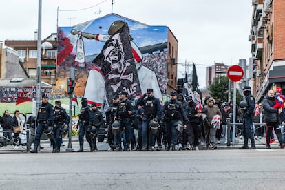 A las 13.00, los bukaneros y otros seguidores del Rayo (junto con alguno del Oviedo) se han reunido fuera del Estadio de Vallecas para hacerse oír. Unas doscientas personas se han plantado una hora bajo la lluvia y el frío coreando en grito “Presa vete ya”, evidenciando la crisis del club a una directiva que lleva años estando en el ojo del huracán por querer, en contra de la afición, mudarse a otro campo en vez de reformar el actual.