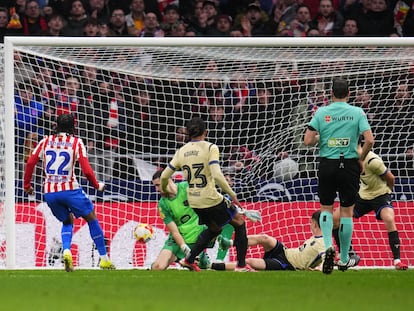 El Atlético está zarandeando al Barça en el Metropolitano. Los rojiblancos se han adelantado en el arranque de la semifinal copera tras un error garrafal de Joan García, que no ha controlado un pase sencillo de su compañero Eric García. Pocos minutos después, Antoine Griezmann ha definido con la pierna izquierda una excelente contra de su equipo para marcar y ampliar la ventaja local a al 2-0. Ademola Lookman, el último gran fichaje atlético, ha anotado el tercero, de nuevo al contraataque. Flick, incómodo desde el arranque, ha movido en el banquillo en el minuto 36: Lewandowski, al terreno de juego. De poco ha servido. Justo antes del descanso, Julián Alvarez se ha sumado a la fiesta y ha anotado el cuarto gol rojiblanco.