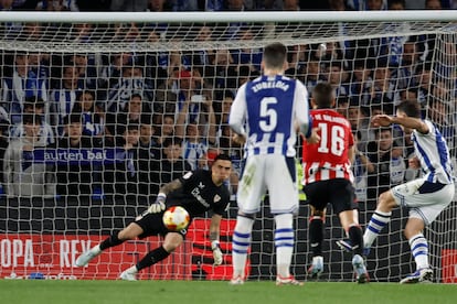 Oyarzabal transforma el penalti engañando a Padilla. La Real, con pie y medio en la final de la Copa del Rey.