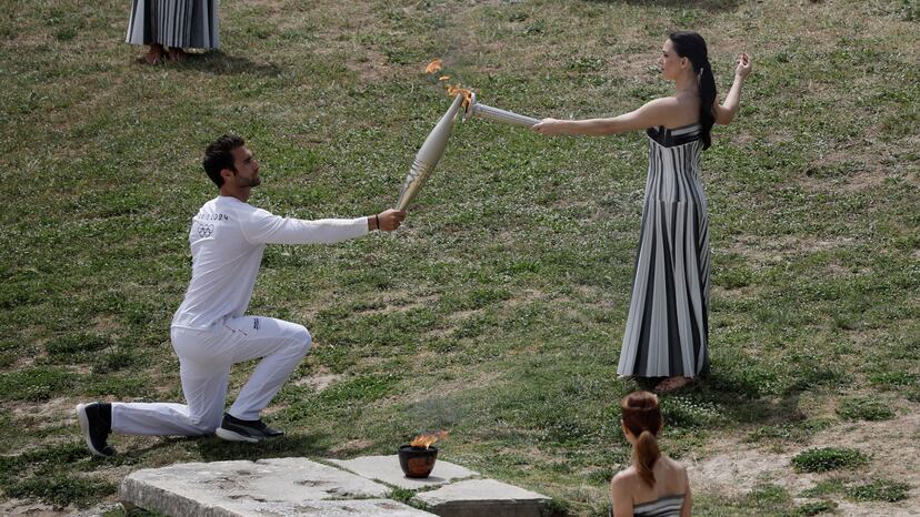 El primer relevista de la llama olímpica ha sido el piragüista griego Stefanos Ntouskos. Tras un breve recorrido lo ha cedido a la francesa tres veces medallista olímpica en natación Laure Manaudou, como representante de la ciudad anfitriona. La llama será oficialmente cedida a los organizadores de los Juegos de París en el estadio Panatenaico, en Atenas, el lugar donde se celebraron los primeros JJOO de la era moderna, en 1896. Esta ceremonia tendrá lugar el 26 de abril, tras un recorrido de 11 días por Grecia. Entonces partirá en barco, en el Belem, un buque de tres mástiles, que llevará la llama hasta Marsella, donde se espera atraque el 8 de mayo, en una ceremonia en la que se esperan 150.000 personas. Allí, el último relevista en la ciudad subirá a lo alto del estadio Velodrome el 9 de mayo. Marsella, que fue fundada por los griegos en el año 600 A.C. alojará las competiciones de vela en los Juegos.