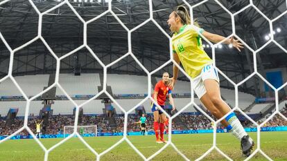 Las brasileñas presionaban arriba o esperaban atrás para lanzar dentelladas al cuello. Por cualquiera de los dos caminos salían victoriosas, sobre todo con el juego directo. La ex del Atlético Ludmila era un tormento por la derecha. Lo sufría Olga Carmona y cualquiera que apareciera por ese carril. No había manera de que España amansara a la fiera. Cualquier intento de imponer desde el toque moría rápido y la defensa se caía a pedazos.