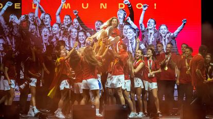 Una multitud recibe a las campeonas en Madrid en una celebración que se alargó hasta la madrugada. Entre los asistentes había una gran cantidad de mujeres de distintas generaciones