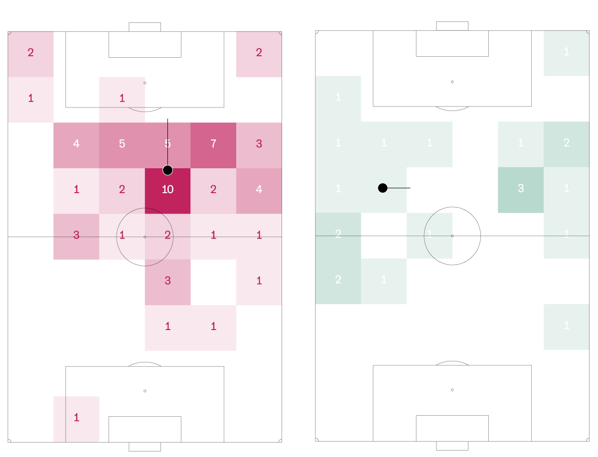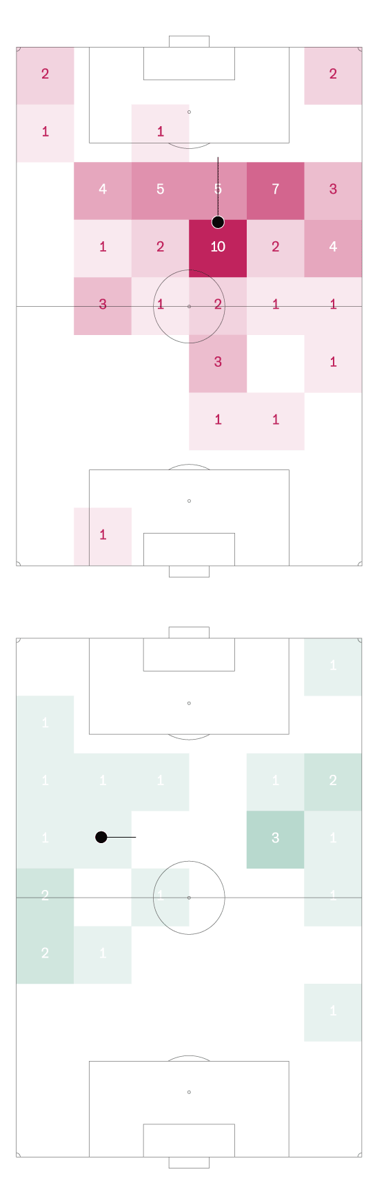 Momentum del partido. Qué equipo está creando más situaciones de peligro en cada minuto. Se calcula a partir de las posesiones de balón recientes de cada equipo y su probabilidad de acabar en gol. Controlar el balón tiene un valor diferente según la posición: no supone el mismo peligro retener la bola entre tus centrales que llevar al área pequeña del rival.