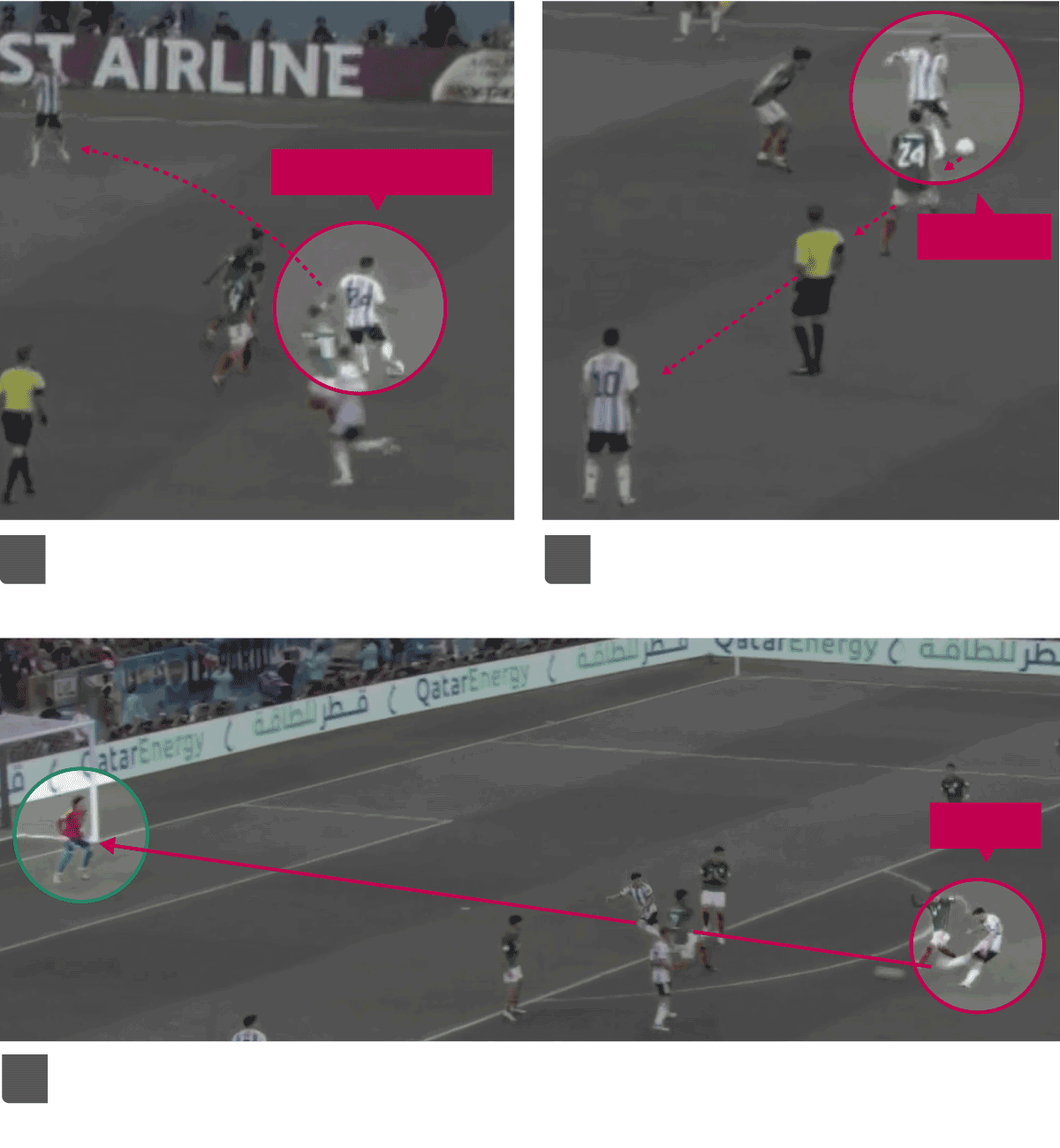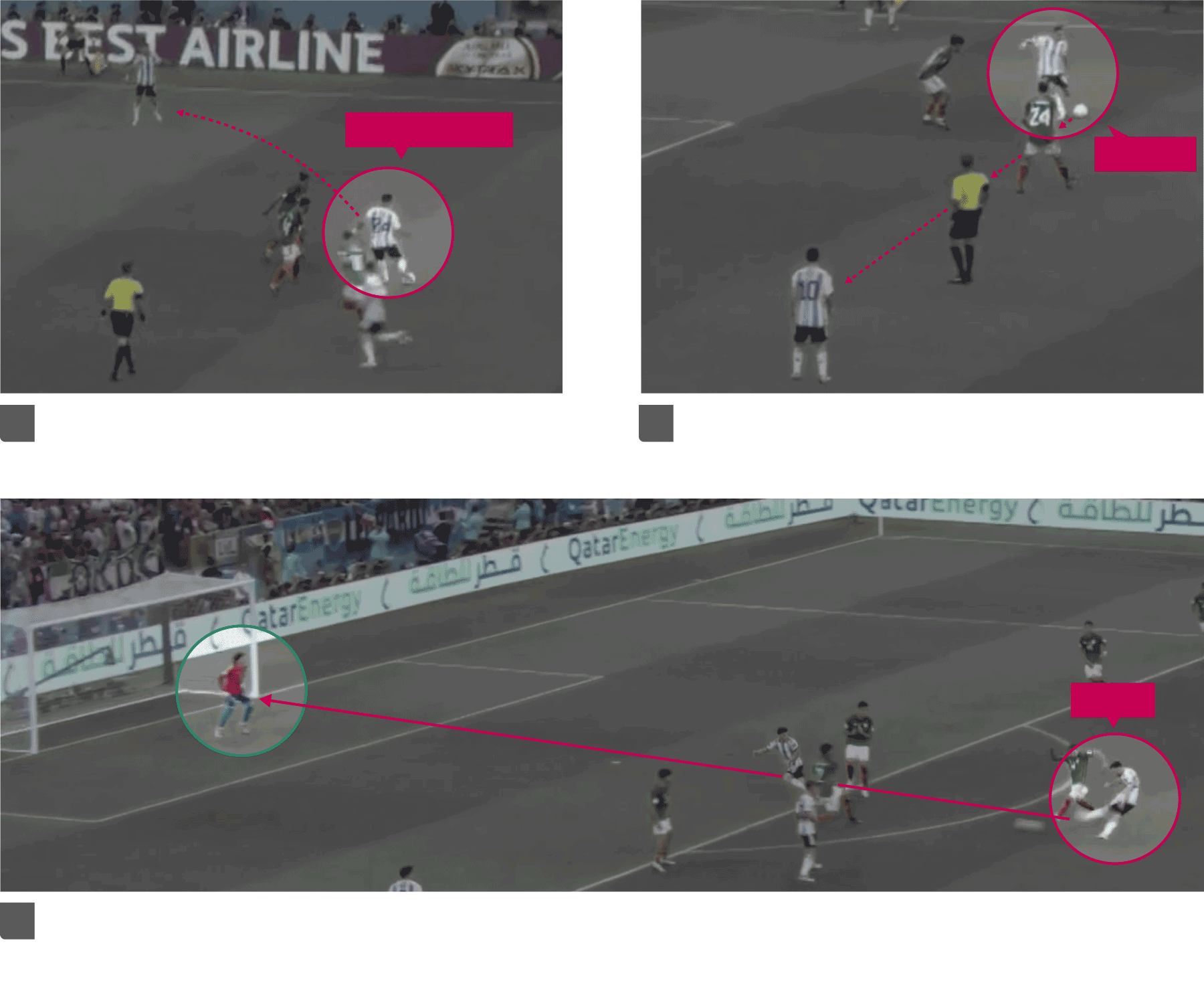 Messi fue el eje del juego de Argentina, jugando en una posición centrada cerca del 9, en la primera parte Lautaro Martínez y en la segunda Julián Álvarez. En esa zona entre líneas que tanto le gusta, el 10 organizó los ataques de su equipo sin necesidad de llegar hasta el área. En el bando mexicano, el más inspirado fue el delantero Alexis Vega, que tuvo las mejores ocasiones de su equipo. En un encuentro en el que los delanteros estuvieron muy desasistidos, el punta logró sacar provecho de sus escasas opciones para crear peligro. Toques de Lionel Messi y Alexis Vega.