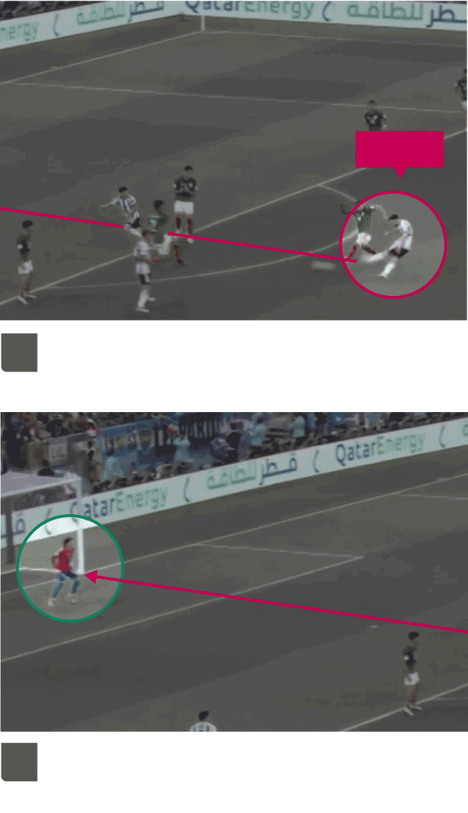 El delantero argentino Julián Álvarez arrastra a los centrales mexicanos dejando espacio a Messi, cuyo disparo evita a tres defensores y acaba con la pelota ajustada al palo izquierdo de Ochoa.