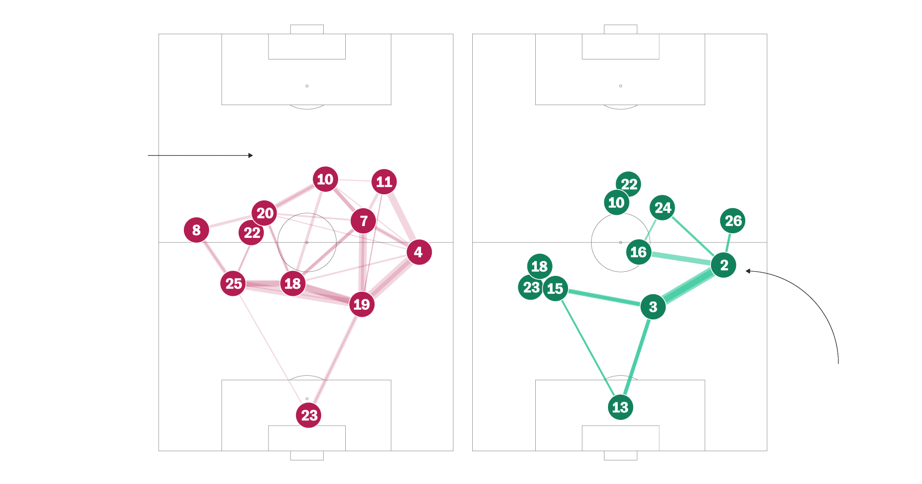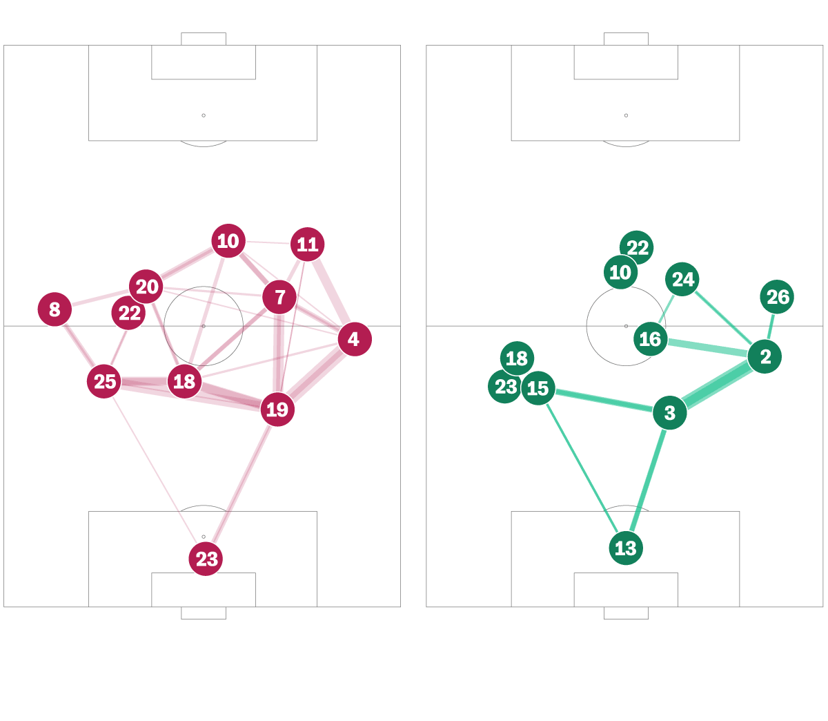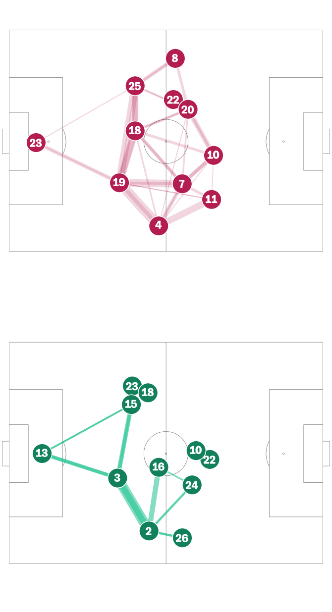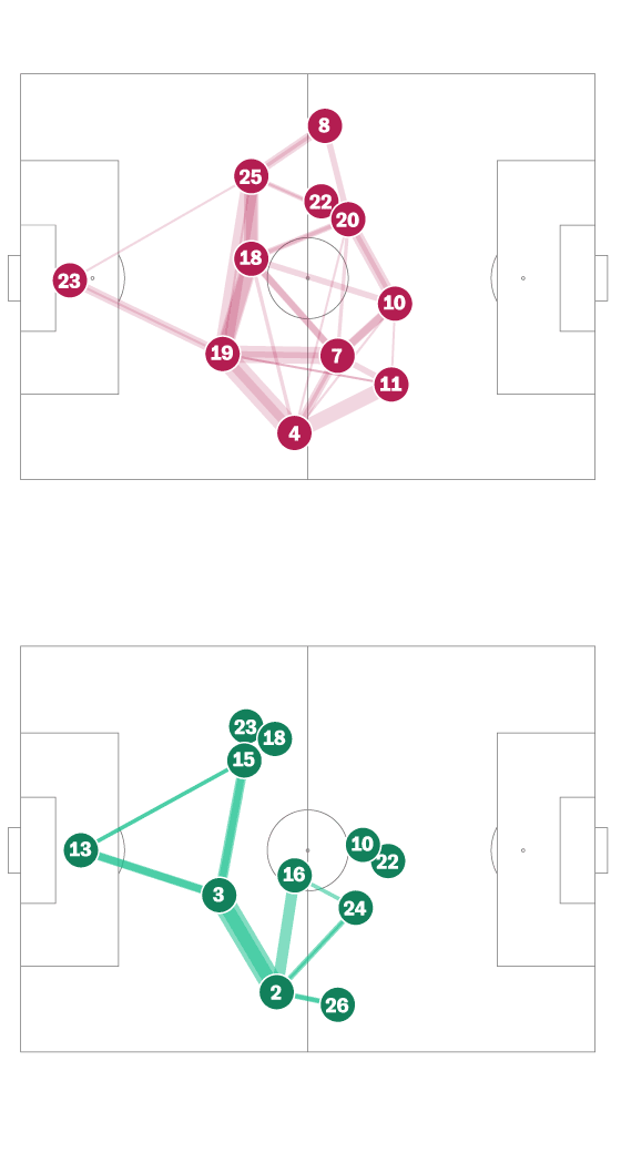 La red que diseñó el Tata Martino para cortocircuitar el centro del campo de Argentina funcionó a la perfección durante más de una hora. Con los carrileros muy abiertos, obligaron a la albiceleste a combinar más por dentro, donde le esperaban los perros de presa mexicanos. Messi bajó mucho a combinar al centro del campo y recibió cinco faltas, el que más del partido. México buscó sobre todo la velocidad por la banda derecha con el Chucky Lozano, pero no llegó a crear ninguna ocasión de verdadero peligro. El siguiente gráfico muestra líneas entre aquellos jugadores que han conectado más de cuatro pases entre ellos.