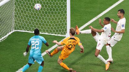 Gakpo aparece poco, pero casi siempre produce un efecto explosivo. Lo hizo a punto de cumplirse la media hora de partido en el estadio de la gran jaima, en Jor, después de que Klaasen y Depay tiraran una pared. Su remate ajustado al palo le equiparó a los cuatro jugadores holandeses que habían conseguido meter tres goles en tres partidos sucesivos de la Copa del Mundo: Neeskens, Bergkamp y Sneijder.