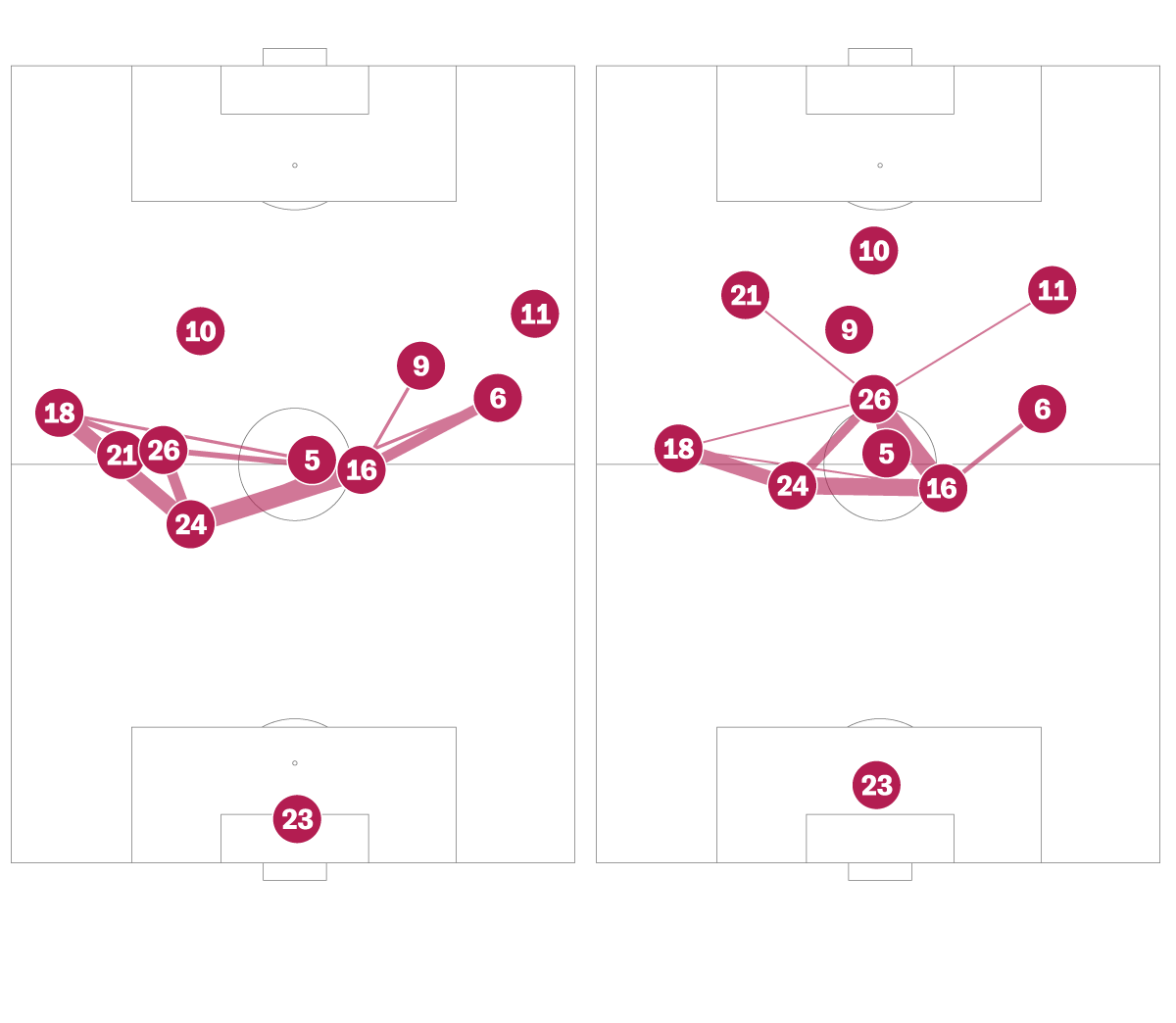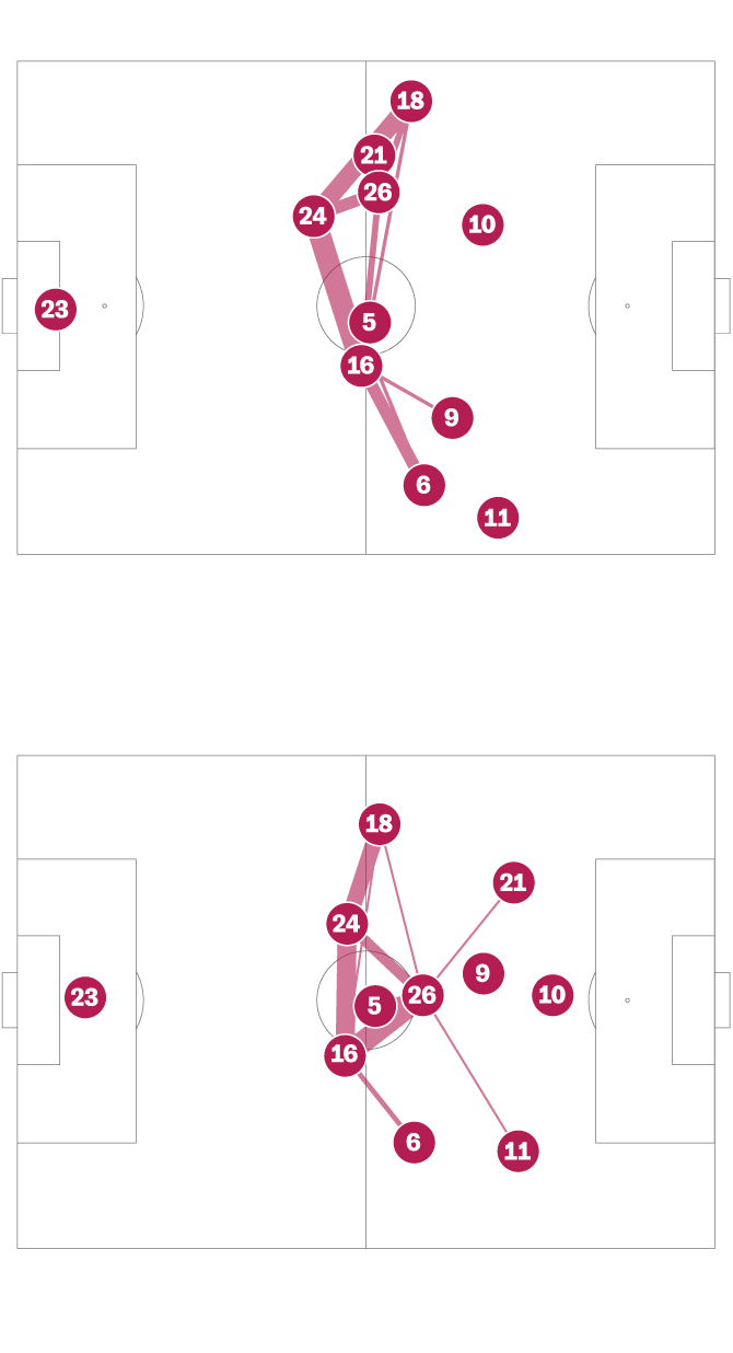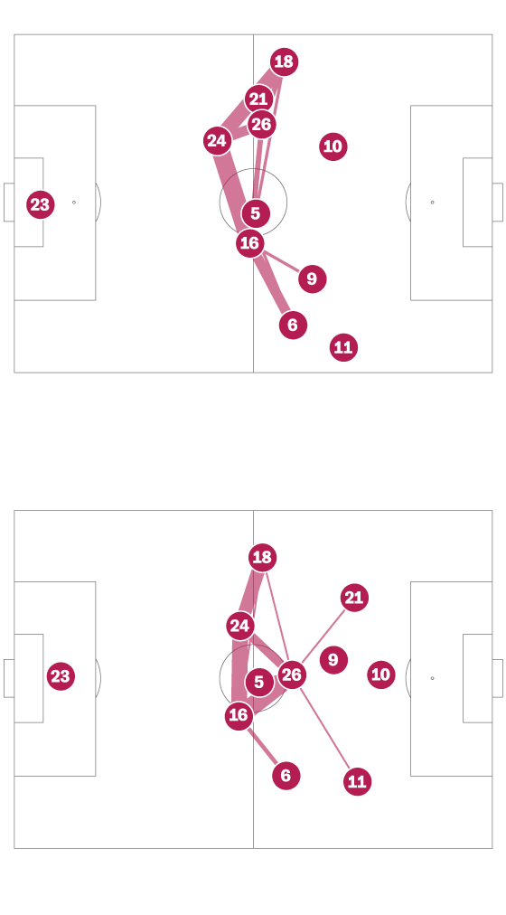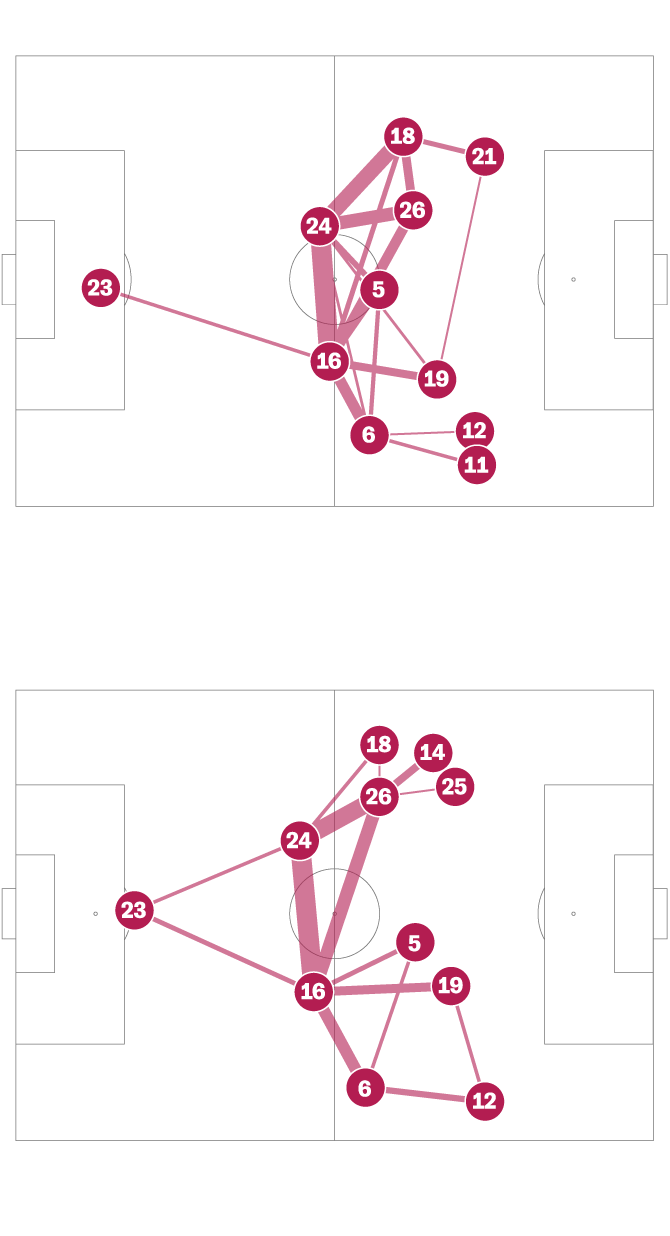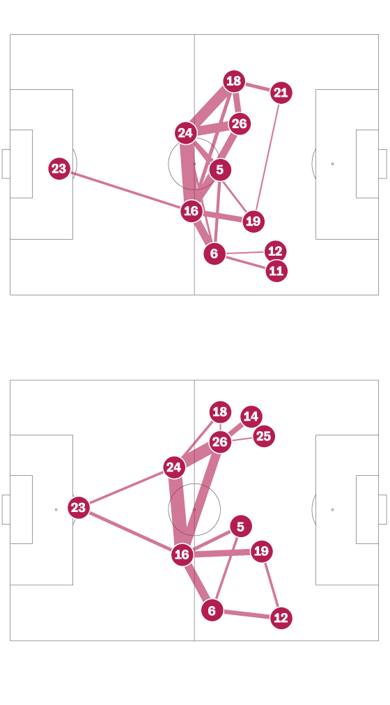 La disciplina de los Leones del Atlas, sin embargo, flaqueó por momentos. El gráfico anterior muestra la posición media de los jugadores de Luis Enrique en los primeros 25 minutos de la primera parte y en los últimos 20: la Roja adelantó sus posiciones porque Marruecos se metió más atrás aún y dejaron más huecos para los centrocampistas españoles.