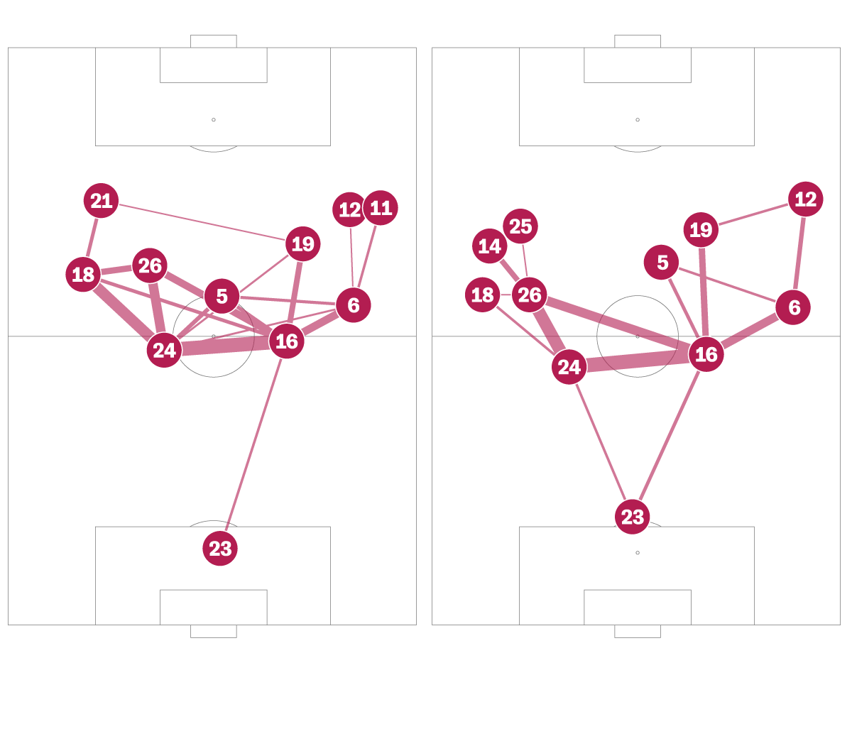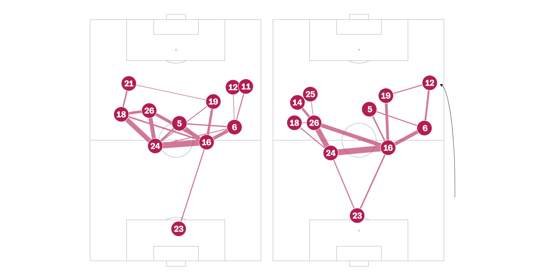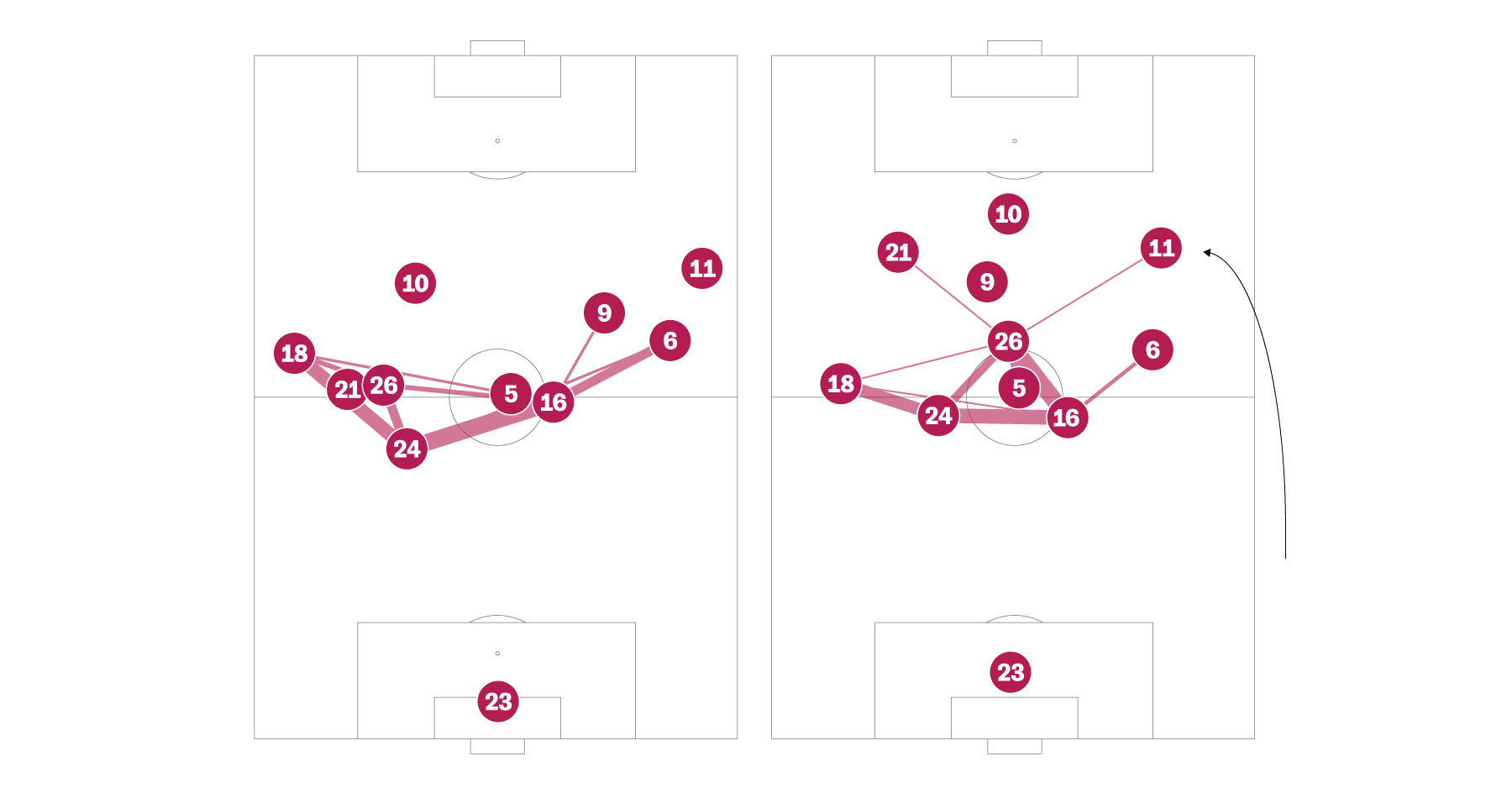 La disciplina de los Leones del Atlas, sin embargo, flaqueó por momentos. El gráfico anterior muestra la posición media de los jugadores de Luis Enrique en los primeros 25 minutos de la primera parte y en los últimos 20: la Roja adelantó sus posiciones porque Marruecos se metió más atrás aún y dejaron más huecos para los centrocampistas españoles.