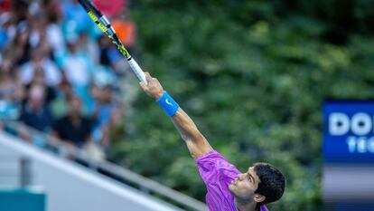Hay imágenes que definen una victoria, y las hay que definen además una circunstancia. De ahí el valor de ese instante en el que Carlos Alcaraz se aproxima a la red, flexiona las rodillas y se impulsa eléctrico, disfrazado del mismísimo Pete Sampras. Al más puro estilo pistolero. Suspendido en el aire, el murciano descarga el enésimo trallazo y vuelve a expresar un día más, para aquellos que no quieran darse por enterados, que aquí está hoy él, El Intratable, El Inabordable, El Insufrible. Como se prefiera. ¡Bang! ¡Bang! Padece esta vez Lorenzo Musetti, todo formas y todo estilo, igualmente abatido: doble 6-3, en 1h 14m. No hay quien pueda hincarle el diente y, a excepción de un tal Jannik Sinner, parece improbable que otro rival pueda cortarle estos días el paso en Miami, una continuación pulida de lo que sucedió durante las dos semanas previas en Indian Wells.