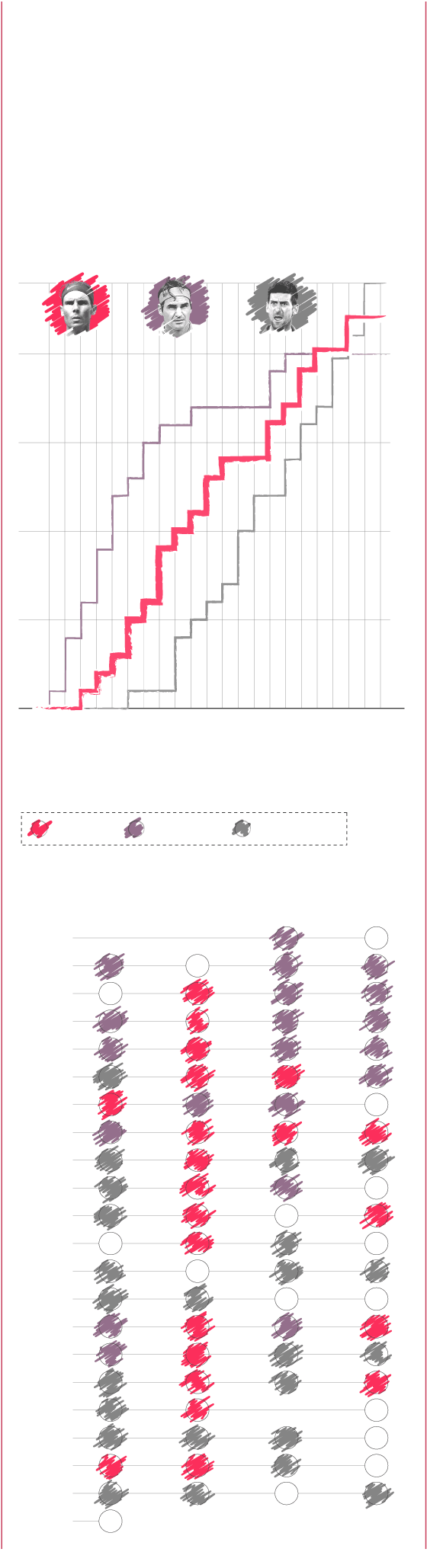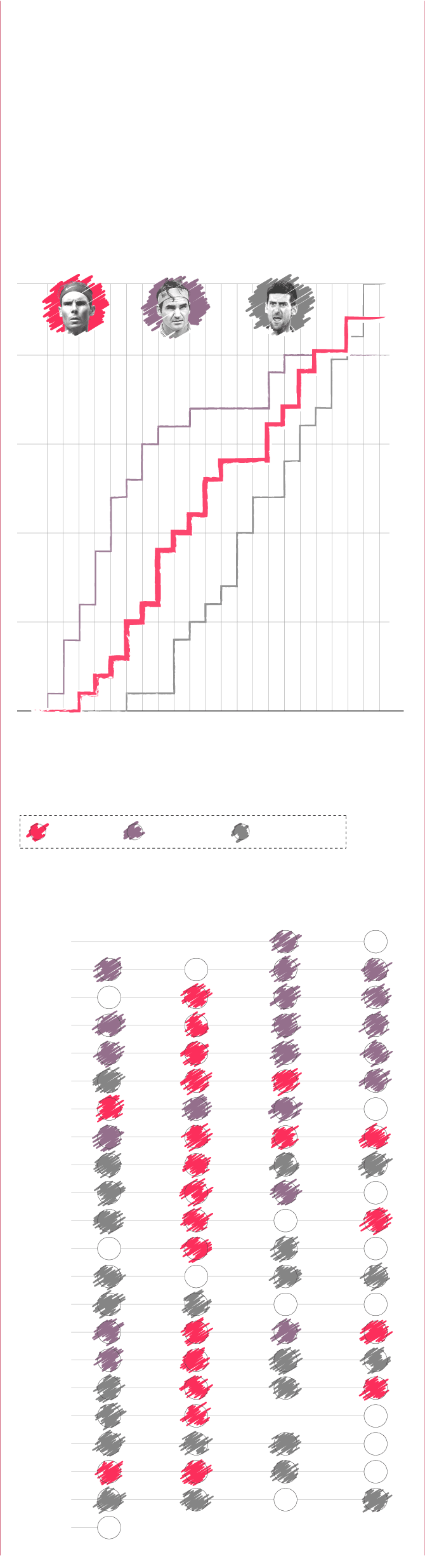 Cuando Rafa Nadal ganó por primera vez en París en 2005, Federer ya tenía cuatro Grand Slam en sus vitrinas. Desde entonces el ‘big three’ se ha repartido 66 títulos de los 83 que han jugado.