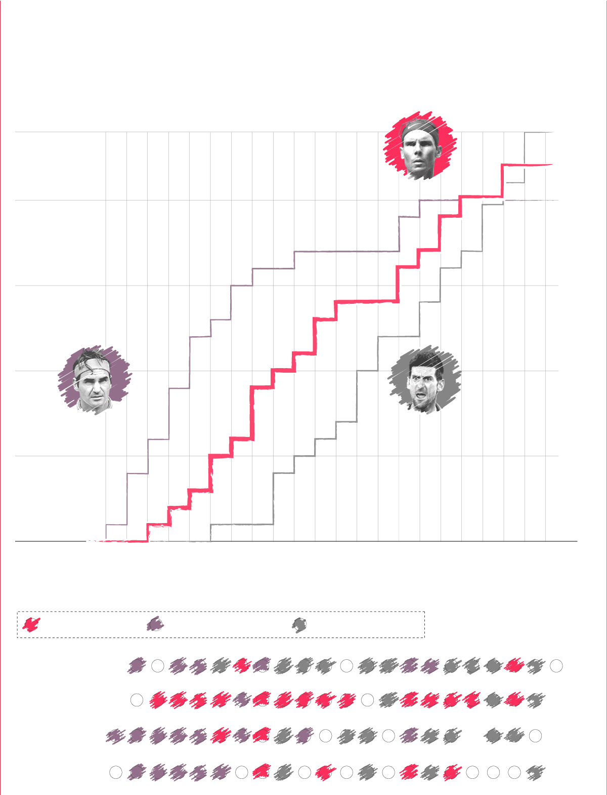 Aquellos que conocen a fondo la historia del tenis coinciden en que no han visto rivalidad mejor alimentada que la que han protagonizado Nadal, Federer y Djokovic en la época moderna. Por calidad, por intensidad, por extensión. Por la plasmación del guion soñado. Un trinomio perfecto en el que cada uno ha asumido un rol diferenciado y complementario desde el punto de vista de la narrativa, tan importante en este deporte. Si al suizo uno se lo imagina jugando de esmoquin y al serbio con un maletín infinito de soluciones, a Nadal se le percibe como el guerrero de la espada. Durante dos décadas, los tres han litigado por ser el mejor de todos los tiempos y los números no dejan lugar a dudas: Nole sale victorioso. El de Belgrado domina en los cruces particulares, en la cifra de Grand Slams o de Masters 1000, y también en cuanto a semanas en lo más alto del ranking.
