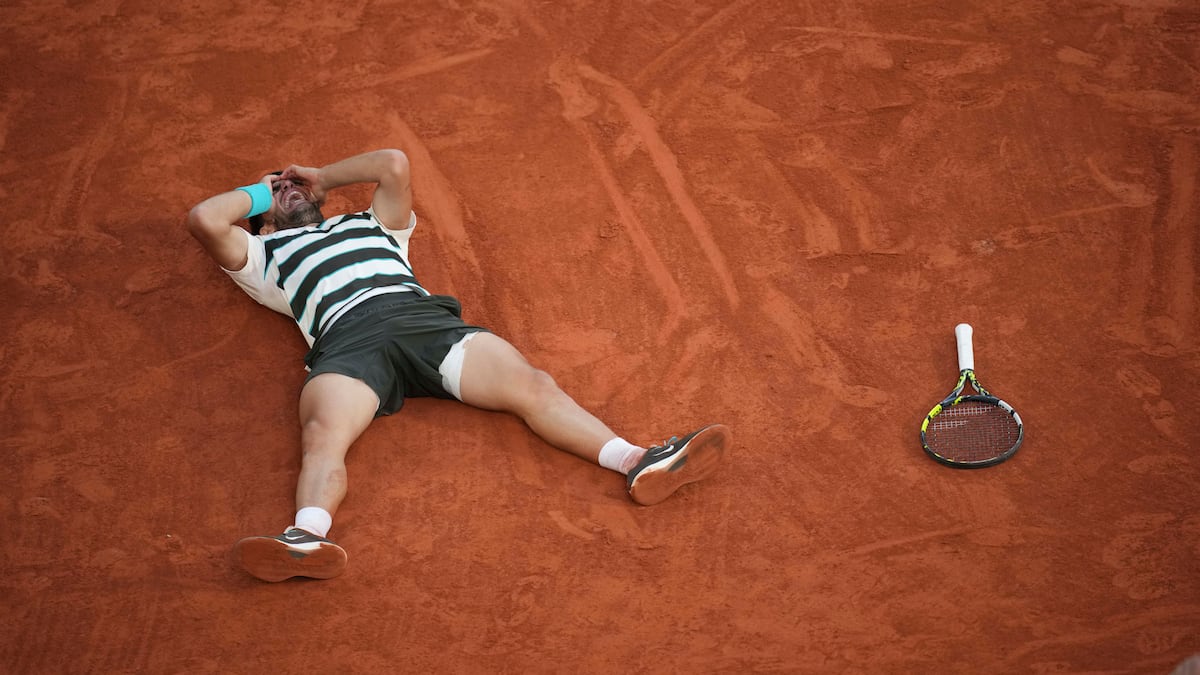 Baila un murciano (también marciano) al son del Emmenez-moi de Charles Aznavour, coronado por quinta vez en un grande, de nuevo en París, donde todo el público de la Chatrier se lleva las manos a la cabeza y el deporte mundial descubre otra mente excepcional. “¡Sí-se-puede!”, le jalea toda su pandilla desde el palco. Y ahí que resurge como un torbellino Carlos Alcaraz, rebozado de barro, grandioso. E histórico esto. Se baten hasta el extremo dos colosos y el número uno inclina finalmente la rodilla. Prodigiosa esta remontada contra Jannik Sinner en una final para guardar, para enmarcar, loca, emocionante. De esas que hacen afición: 4-6, 6-7(4), 6-4, 7-6(3) y 7-6(2), tras 5h 29m. Tranquilo todo el mundo: el tenis está en inmejorables manos.
