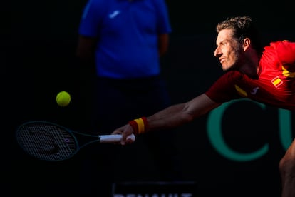 “¿Y por qué no?”, deslizaba la noche anterior Ferrer, entre los gestos mustios y el preocupante dato que deslizaban los libros de la Davis: el equipo español nunca había levantado esa desventaja. Pero a la fe inquebrantable del preparador, un optimista por naturaleza, le acompañó la de sus jugadores, quienes voltearon la serie frente a los nórdicos merced a los triunfos encadenados de Pedro Martínez y Jaume Munar en la modalidad de dobles (1-6, 6-3 y 6-2 a August Holmgren y Johannes Ingildsen, en 1h 46m), el de Martínez contra Holger Rune en el primer turno individual (6-1, 4-6 y 7-6(3), en 3h16) y el definitivo de Pablo Carreño ante Elmer Moeller (6-2 y 6-3, en 1h 25m). En resumen, convicción, oficio y un protagonista insospechado.