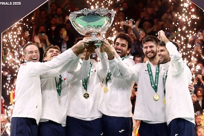 Hoy por hoy, también el de Italia, dominadora absoluta del momento. Sigue extendiendo brazos y tentáculos, al mismo tiempo que se reconoce el más que meritorio trazado completado por el equipo de Ferrer, terco y convencido, reivindicativo y pujante. Lo intentó hasta el final, con fe, sin escatimar. En tiempos de binomio y de culto al individualismo, Alcaraz-Sinner y Sinner-Alcaraz, bien valga su recorrido para ensalzamiento de los secundarios. Aires refrescantes como colofón a la temporada. Nadie contaba con ellos, pero estuvieron cerca. Un sueño real hasta que se interpuso la gran potencia actual, vencedora en Bolonia. Italia, tres veces Italia.