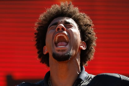 Dispone y ordena en el sorteo el gran Manolo Orantes, tenis de otra época. Poco o nada que ver con lo de hoy: fuerza, velocidad, potencia, la pelota dibujando trayectorias rectas. Es una final en la que escasea la muñeca y en la que ambos buscan con descaro el revés del rival, y por esa vía la envuelve mejor el francés, con bastante más picante. “¡Oooohhh!”, se oirá unas cuantas veces. No de la boca de Marcus Rashford, el extremo del Barça que observa imperturbable, detrás de unas gafas modernas, ¿artista, actor o futbolista?; tampoco se inmuta Jules Koundé, el tipo siempre tranquilo; y aplaude con ganas Dani Olmo (asiduo por aquí) ese magnífico globo cruzado de Fils que cae en el ángulo. “¡Bravo!”.