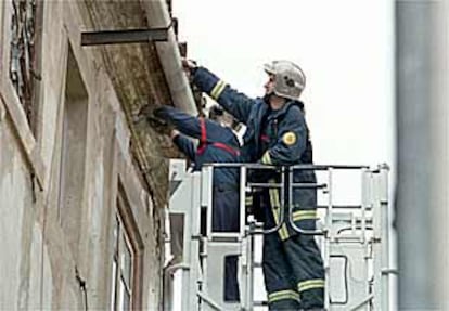 Los bomberos realizaron ayer varios servicios en los barrios del centro de Valencia por desprendimientos de cornisas tras la lluvia caída en la noche del pasado jueves. El mal estado de muchos de los inmuebles del casco viejo les hace vulnerables en cuanto se producen tormentas. Ayer, en la calle de Maldonado parte de una cornisa cayó sobre dos vehículos estacionados. Minutos después, en la calle de Fos los bomberos tuvieron que apuntalar otra cornisa que amenazaba con caer desde un cuarto piso.