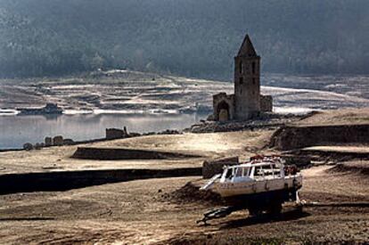 Los embalses catalanes disponen tan sólo de una cuarta parte del agua que son capaces de almacenar. Es el caso del pantano de Sau, donde el agua apenas llena el 25,58% de su capacidad total, como muestra la fotografía. La sequía ha agravado el déficit hídrico de Cataluña y la situación puede empeorar cuando comience la temporada de riegos generalizados en el campo. El Gobierno catalán aprobó en enero un decreto que prevé medidas excepcionales si la situación no mejora y los niveles de agua almacenada en los embalses bajan del 20%. El consejero de Medio Ambiente, Ramon Espadaler, confía en que el trasvase del Ebro, las desaladoras que se están construyendo y la concienciación de los ciudadanos sobre la necesidad de no malgastar agua palien el problema.