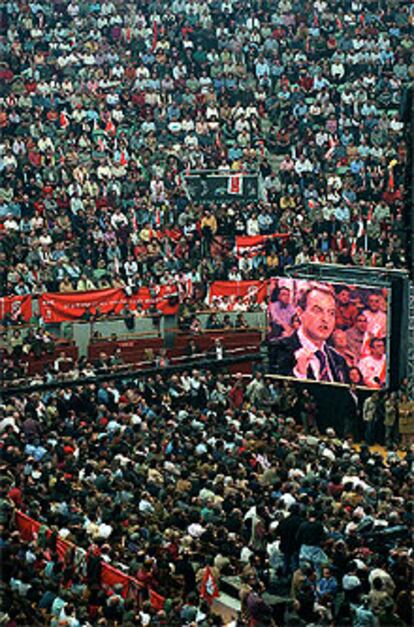Mitin en Vistalegre para la proclamación del candidato del PSOE a la presidencia del Gobierno: imagen del público en las gradas durante la intervención de Zapatero.